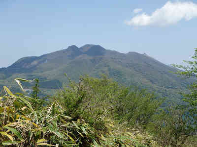 丸岳山頂から眺める風景 すぐに平坦な丸岳の山頂へ到着、南には大涌谷と神山、その右に芦ノ湖の展望、芦ノ湖の手前にはゴルフ場が見えている。山頂から少し北へ向かうと、笹原の先にアンテナが建ち、その左に富士山が美しい姿を見せている。丸岳からは、箱根方面の展望がずば抜けて美しいので、ベンチに腰掛けながら小休止を取り、昼食のおむすびをほおばる。