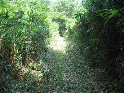 すぐに樹林に入る事になり、同時に周囲の展望もなくなった。沢に架かる橋を渡ると正面に分岐が現れ、この分岐を左に取り進むと右手に鹿除けネットを見るようになる。その先の道では登山路の草が綺麗に刈られており、地区の方の鼻高山に対する思いが伝わってくるようだ。