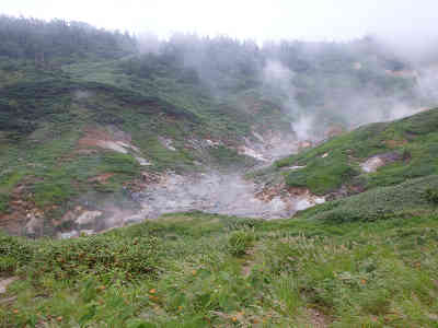 途中には温泉の噴気の吹き出す場所もあり、そのあたりでは植物が育たないようだ。やがて藤七温泉綾雲荘へ着くと、なんと入口の案内には、営業は午後6時までと掲示されてある。すでに6時を過ぎているので次の場所を探さないといけない。そこで松川温泉峡雲荘へ連絡すると、こちらは午後10時までの営業とのこと。