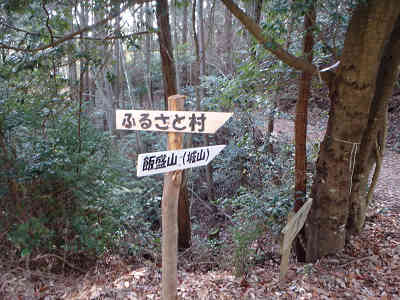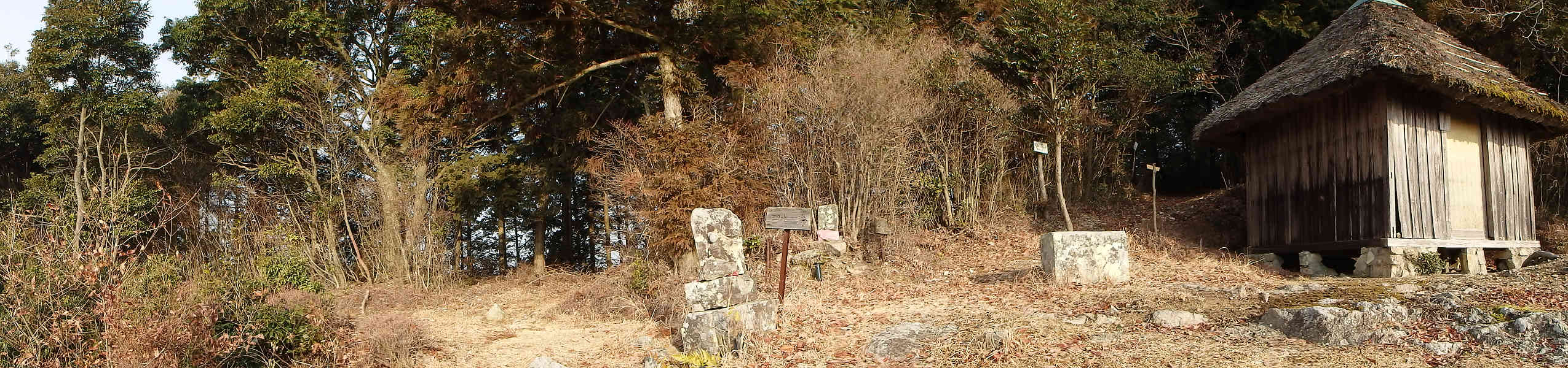 この途中に47番の案内を過ごし、更に下れば48番を左に見る。この付近には山頂へ450mの案内もあるので、道に迷う心配は無い。緩やかに右方向へカーブを描きながら進めば、山頂へ550mの案内とふるさと村の案内標識の立つ分岐へ着く。右に簡易給水施設浄水場を眺めて道なりに進めば、左に飯森山(城山)の案内が置かれていた。時間の余裕があれば立ち寄りたいところだが、本日は3山を予定しているため断念する。 前方が明るくなれば、左に大きな石碑が現れた。この場所こそが皇屋敷跡で、後鳥羽上皇が隠岐へ配流される際、一夜の露をしのいだ所と伝えられている。屋敷跡には石盤が置かれ、歴史の詳細が記されている。