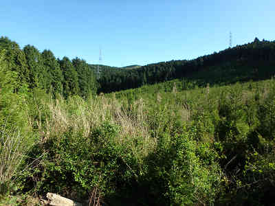 足下に咲く花を眺めながら進むと、間もなく植林帯の中に入る。美しい木漏れ日を眺めながら進むと、頭上に送電鉄塔を過ごす。間もなく樹林の伐採された所へ着き、ここでも送電鉄塔を過ごし、少し緩やかな坂を下れば次は自然林の中に入る。
