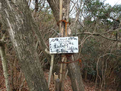 足下に草などが多いのですぐに山頂を出発、分岐まで引き返した。分岐から中宮別れまで引き返し、今度は烏帽子岳方面へ向かってみた。急な坂を登り、最初のピークへ着けば「ピーク14」の案内があり、頭上には旗が1本置かれていた。この308mポイントは黒杭・成川への下山口でもあるようだ。