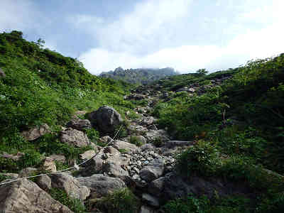 岩の目立つ登山道 進行方向の山並みはでこぼこしており、早池峰山の予備知識は皆無だが、火山なのかも知れない。何度か沢を渡っていると、前を歩いていた登山者を追い抜いてしまった。少しずつ歩くペースが上がっているのかも知れない。相変わらず沢沿いに高度を上げ、前方に広がる山頂を眺める。やはり山頂部がでこぼこしているのは間違いないようだ。