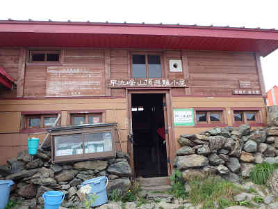 右にハイマツを眺めながら急な坂へ向かっていると、ようやく坂の傾斜が緩み始め、突然という状態で平坦な山頂へ到着した。山頂先には避難小屋が建ち、避難小屋の手前左には早池峰山の祠が祀られ、その手前には一等三角点が埋め込まれている。更に左には朱の早池峰神社が祀られており、特徴的な剣状のモニュメントがあちこちに置かれている。 山頂へ到着(クリックで拡大)