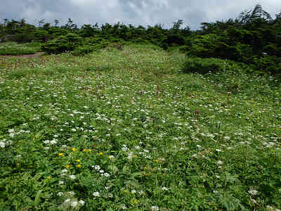 登山道の周囲はお花畑 進行方向を眺めている時には感じなかったことだが、登ってきた方向を見下ろすと、坂の傾斜のきついことを今更ながらに思い知らされる。本日はとにかくゆっくり歩きを心がけているため、疲労感なく登っている。一本調子で坂を登っているが、足場を選び、歩きやすい場所を確認しながらの登山はとても新鮮である。