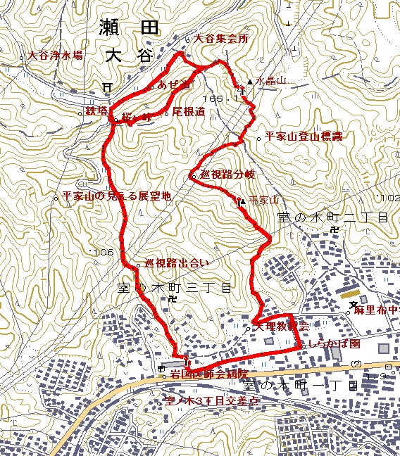 2012年1月14日 岩国市医療センター →0:10→ 天理教教会横 →0:20→ 平家山 →0:20→ 水晶山 →0:05→ 大谷峠(ヤブの尾根伝い) →0:20→ 桜ヶ峠 →0:25→ 岩国市医療センター(大谷峠下のあぜ道経由) →0:05→ 桜ヶ峠 →0:25→ 岩国市医療センター 全歩行時間 ヤブの尾根伝い 1時間40分 大谷峠下のあぜ道経由 1時間25分 いよいよ岩国山周辺の最終段階。今回は「山口県の山(山と渓谷社)」の著者、中島先生と一緒に岩国市室の木地区から平家山・水晶山の山頂を踏んで大谷峠まで行き、大谷峠からは尾根を中央突破し、桜ヶ峠まで抜ける行程を採る。 前回駐車した「麻里布町第四街区公園」の付近へ行き、駐車場を探すが車を置いた場所が分からない。公園の周囲を周回してみるが、やはり駐車場が見つからないので岩国市医療センターまで移動する。なお、この駐車場は無くなってしまったようだ。