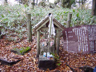 雪の降りだした烏帽子山を後にして次の比婆山(御陵)を目指して出発をした。烏帽子山から落葉のブナ林の中をゆっくりと進んで行き、烏帽子山から20分程度で御陵に到着した。御陵には既に10名以上のパーティーが休憩をしていた。御陵は伊邪那美命(いざなみのみこと)の墓とされている神聖な場所のようで、中央部には中に入れないように鎖が張ってある。