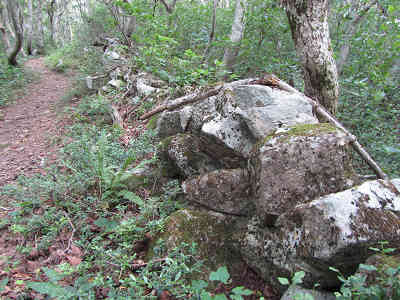 伊良谷山から高度を下げると、右に人工的な石組みが続いていることに気がついた。これは、道後山と同じく牧場の境界かも知れない。規則正しい石組みが長い距離で続いており、これだけの作業を人力で行うのは大変な作業である。