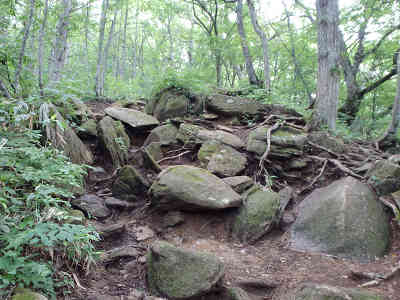 更に奇岩大岩を超えると坂の傾斜が増し、横木の階段道に入る。ここでも急登を踏ん張り、左に長方形の大岩を過すと七合目に着く。ここで足下を眺めているとヤマジノホトトギスの花を見つけた。この付近でようやく花を観賞できるほど、心が落ち着いた。間もなく階段が切れ、進路はわずかに右方向へ変わる。