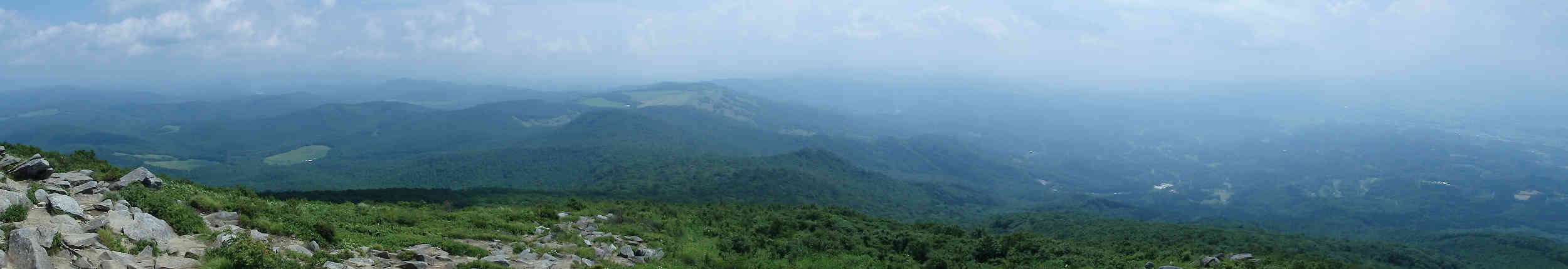 次に現れるのは山頂まで300mの案内で、この付近で大勢の下山者とすれ違った。足下にかわいい花を観賞し、頭上にも白い花を観賞、少しずつ周囲に花が増えてきた。雨宿りのできそうな水平に伸びる岩を二つ過ごすと、頭上を覆っていた樹林が切れ、眼下に展望が広がり始めた。ただし、梅雨明け間際の水蒸気の多い状態なのか、展望自体は少し霞気味となっている。