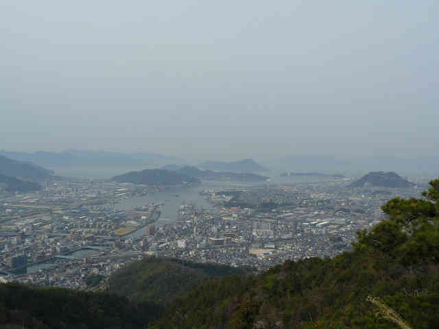 日浦山山頂 山頂からは周囲360度の展望が広がり、少し霞は懸かっているが絵下山や広島湾に浮かぶ江田島・能美島・似島・宮島が美しい。少し場所を変えると西には広島市街が広がり、遠くには大峰山・極楽寺山がかすかに浮かび、南西方面に火山・武田山、北面には大岩の目立つ高尾山・アンテナの立つ呉裟々宇山をしっかりと確認することが出来た。やはり一回登った山は形や場所が頭に入っており、すぐに山頂を確認する事が出来る。