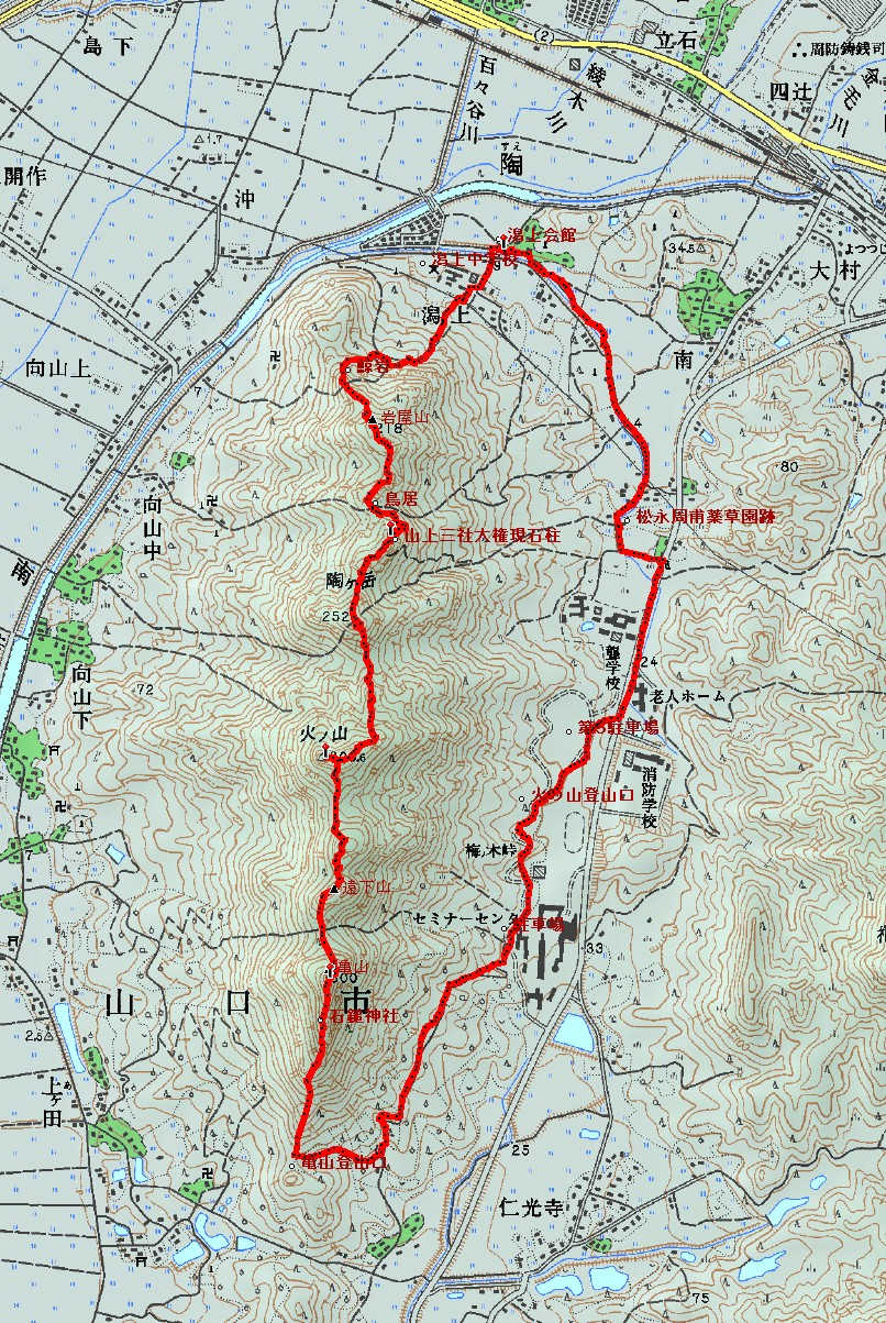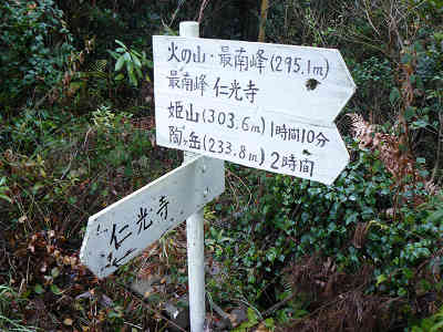 2017年11月 7日の火の山連峰(亀山・火の山・陶ヶ岳)を読む 潟上会館 →0:40→ 岩屋山 →0:30→ 山上三社大権現の石柱 →0:40→ 火の山 →0:50→ 亀山 →0:40→ 亀山登山口 →0:25→ セミナーパーク駐車場 →0:25→ 陶ヶ岳登山口(松永薬草園) →0:10→ 潟上会館 全歩行時間 4時間20分 新しい年に新しい山を。山口市のセミナーパーク上に連なる火の山連峰、以前火の山から陶ヶ岳への縦走をしているが、火の山連峰の中で亀山だけはまだ登っていない。今回は火の山連峰の完全縦走をすることにより、新しい山頂を踏むことが出来る。完全縦走の方法としては南側の仁光寺コースを採り、亀山方面から登るルートと、北側の潟上中学校の横を抜ける潟上コースとなる。