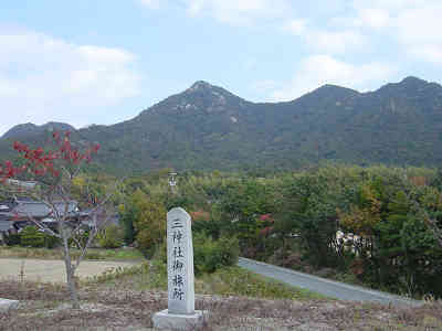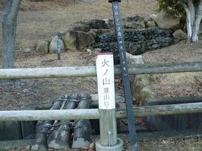 次に登山口である南若川側の三神社御旅所の石碑のある駐車場に行き、登山を開始した。目の前には火の山の尖峰が美しい。舗装道を進んで行くと、すぐに黄色い看板の火の山登山口道標が見えてくる。