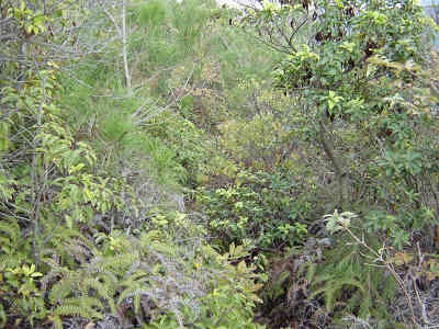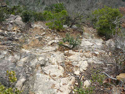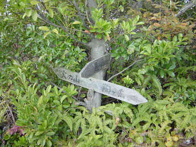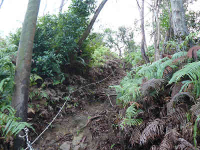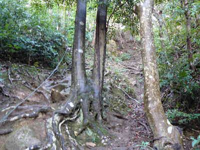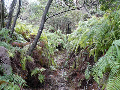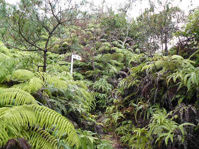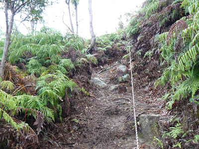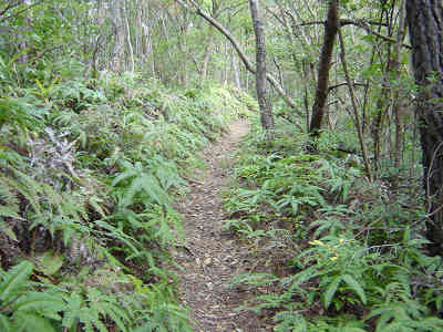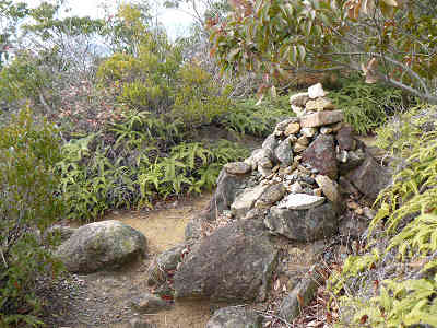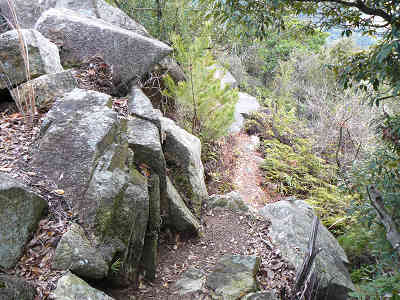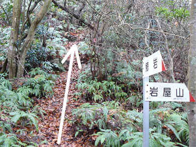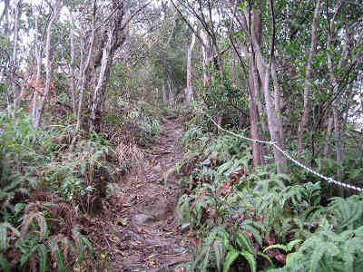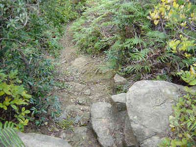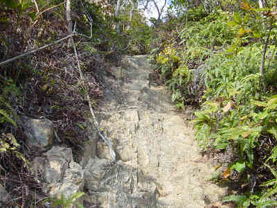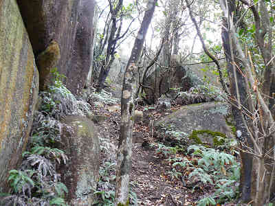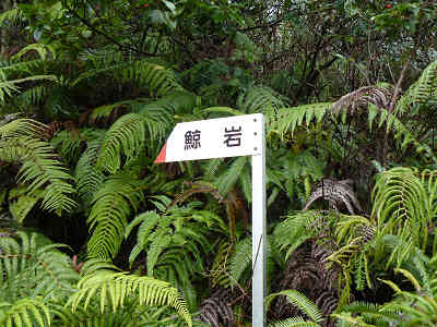 登山道は急な斜面であるが、大した苦労もなく高度を稼いで行く。前方に再び鯨岩の標識が立ち、更にシダの道を進めば石垣の組まれた場所に着くので、石垣の場所から右手に進路を採り、鯨岩の標識を確認し進む。