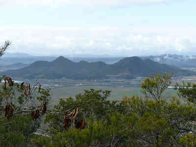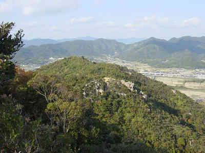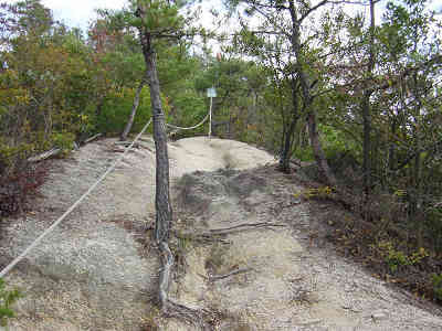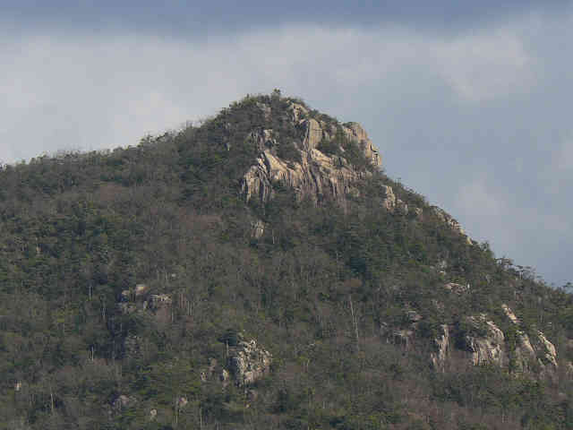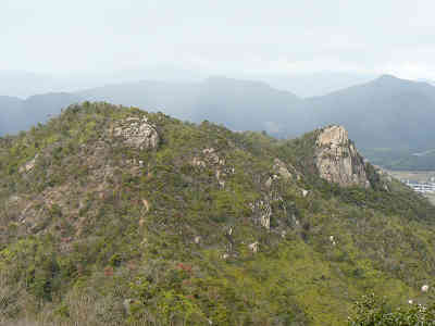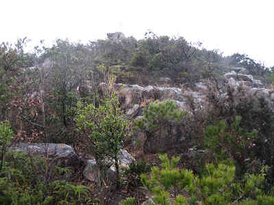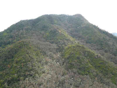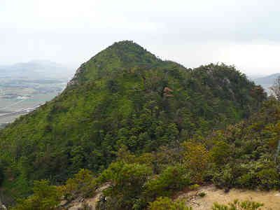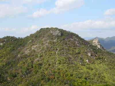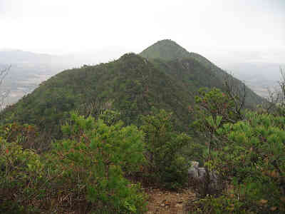 亀山への分岐に入り、雨で濡れた岩斜面を下りて行く。適度な湿りがあるので斜面は滑りにくくなっている。但し、下りてきた方向を振り返ると凄い斜面を下りてきたことが分かる。鞍部に下りてロープの渡された急な斜面を登り返す。間もなくピークに着き、左手に広がる広場から火の山方面を振り返る。やはり凄い岩の上に立っていたことが分かる。