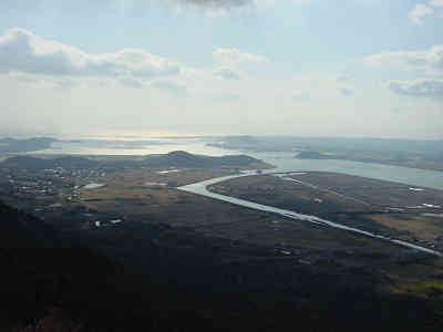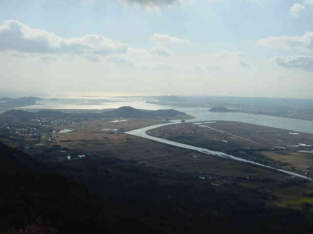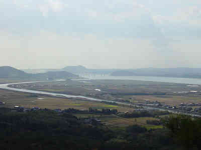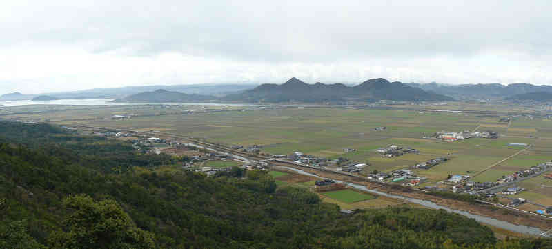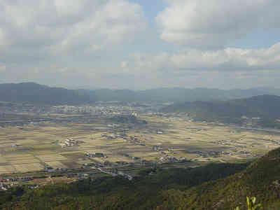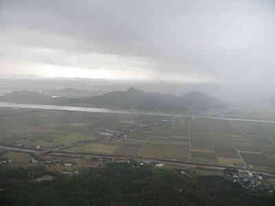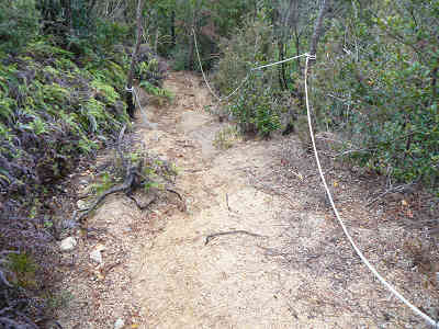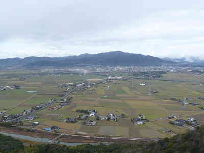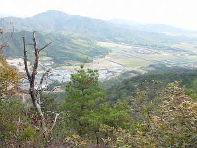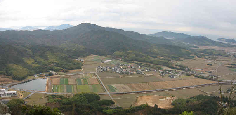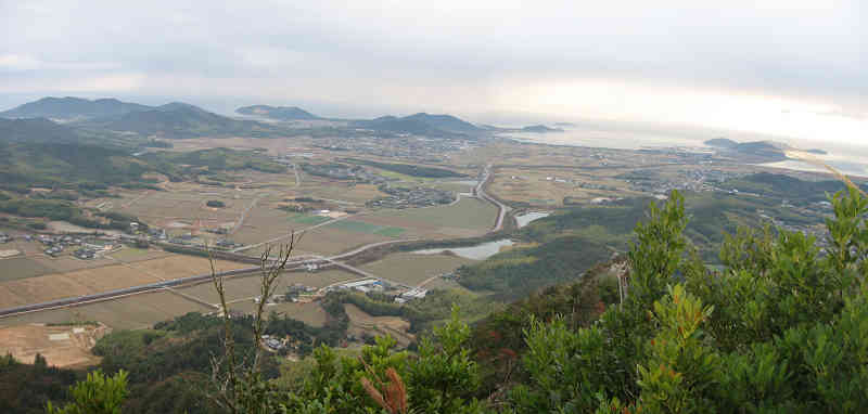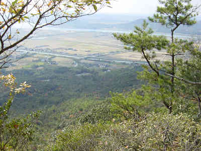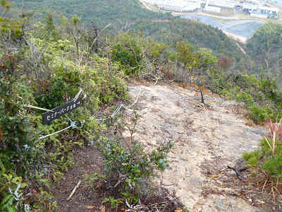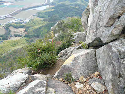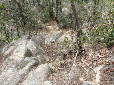 登山開始から20分でロープの渡された急な滑る坂を登ることになる。これから先はこのような滑りやすい道が続くようだ。眼下には名田島の田園風景と百間橋の展望が広がっている。