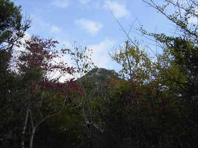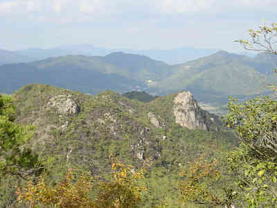 この先から急な斜面を下りて行くが、今日はアップダウンの繰り返しが楽しい。いかにも滑り易い土質の道を下り、自然林の茂る鞍部から登り返す。空を見上げると曇ってきたのが少々気になる。少し登り返して背後を振り返れば岩山は美しいが、その後は霞んで全く景色が見えなくなっている。