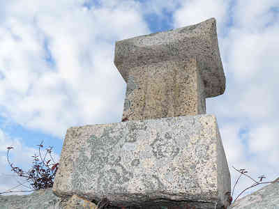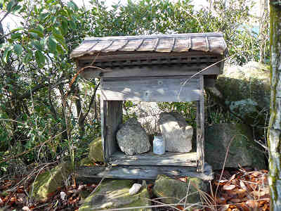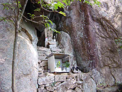 石鎚神社の祠 岩の横をロープの助けを借りながら抜けて行き、一気に高度を下げてゆく。岩また岩の道は楽しいが、やがて岩道は終了、白い石柱のような岩を過ごすとロープの渡された急斜面が続く。左手にコンクリート製の施設を過ごし、左右にシダの茂る道を下れば標識の立つ登山口に到着。ここから陶ヶ岳まで2時間と記載されている。