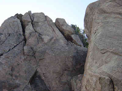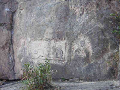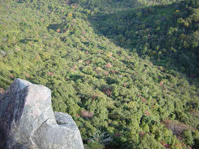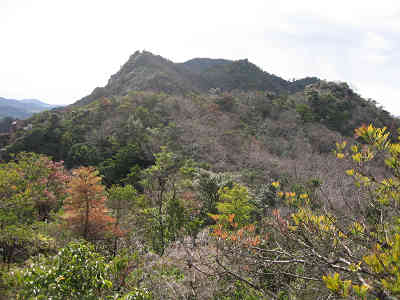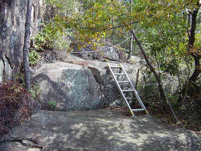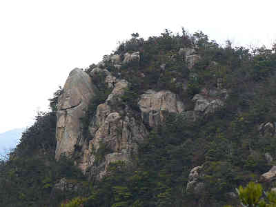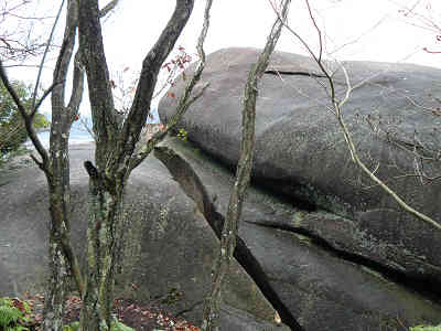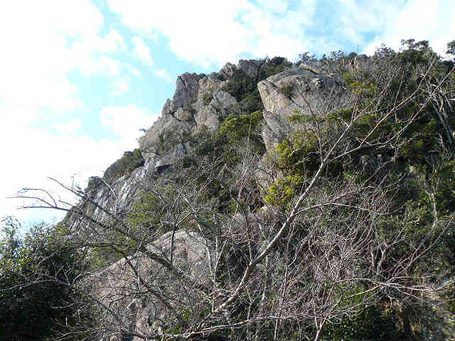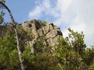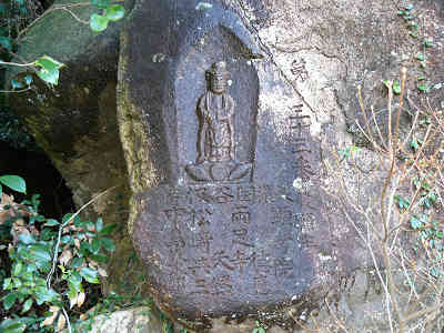 陶ヶ岳を少し降りると観音像の彫ってある地点に着いた。この付近はロッククライミングのメッカということで、ロッククライミングの跡が鮮明についていた。岩屋山との分岐を過ぎて下って行くと山頂からは20分で松永氏邸に到着した。