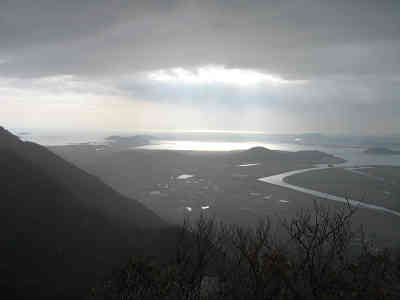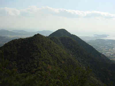 山頂からは東に勘十郎岳、亀尾山(大海山)、そのまま南に向けて串山連峰と続き、瀬戸に映える日射しが美しい。自分の立っている位置を地図で確認後、大縦走を完成させるため下山を開始する。