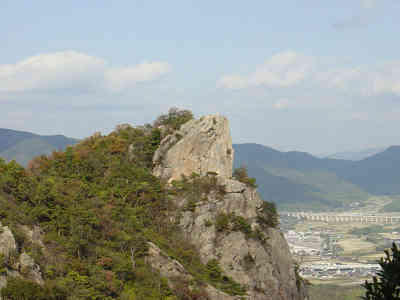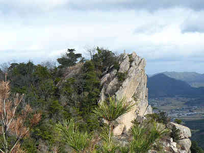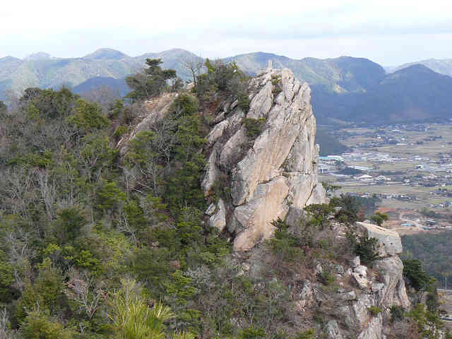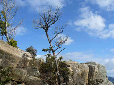 これから一旦高度を下げ、登り返すとピークに着いた。この付近で今まで曇っていた空に青空が現れてきた。大岩を観賞しながら尾根伝いを右方向へ進路を取り、周囲に広がる展望を眺めた後、再び大岩を過ごしピークを下る。自然林の茂る鞍部に着けば大鳥居が待っていた。