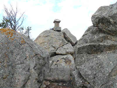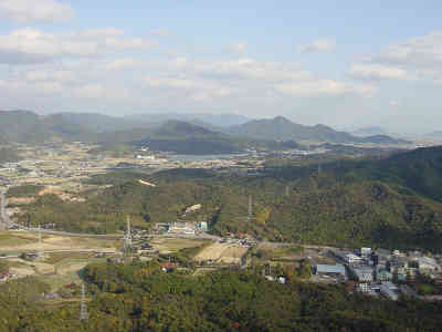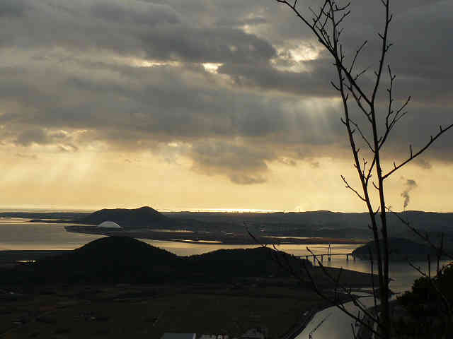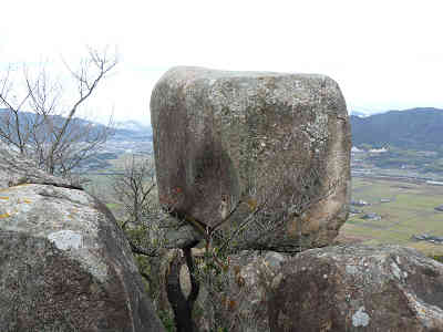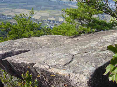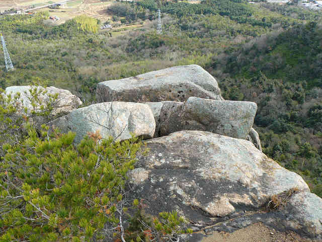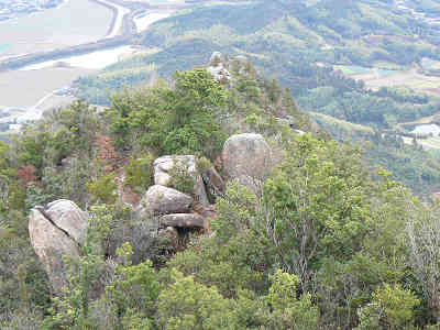 亀山から周囲の展望(動画) 亀山から南に向かって下りて行けばその岩の連続にワクワクする。どの方向に下りて行けばよいのか、下山道を探すのも楽しく、背後を振り返れば岩の道が美しい。間もなく石鎚神社の祠に到着、石鎚神社に沢山のお願いをし、更に下山を続ける。大岩の上から瀬戸内海を眺めれば、きららドームの先に広がる波光が美しい。