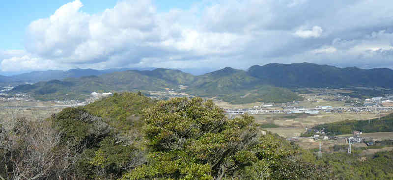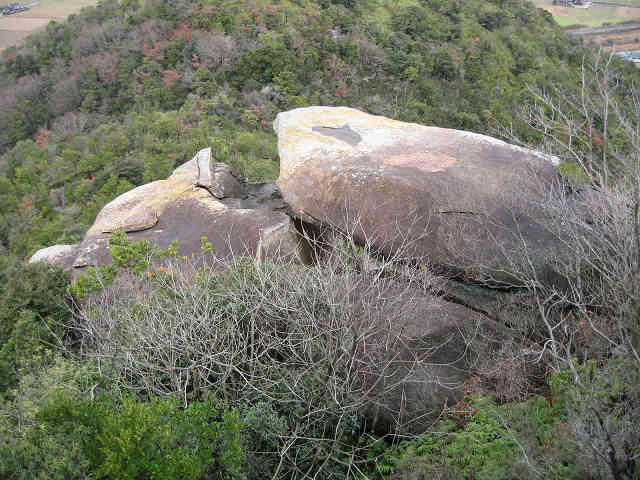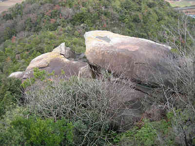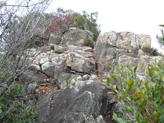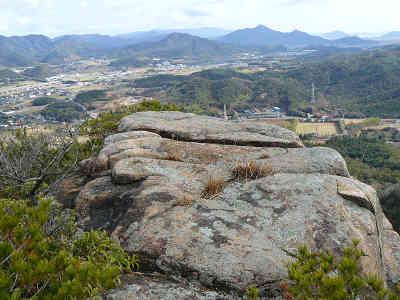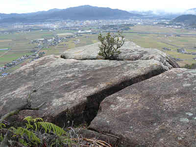 大岩の横を抜け、少し進むと岩屋山への分岐標識は右手に下る方向を指しているが、そのままシダの間につけられた踏み跡に従い、真っ直ぐ進むことにした。左右にシダの茂る道を直進、急な斜面を登って行くと、「標高210m」と標識に記載されている岩屋山山頂に到着。山頂からは方向によっては木の間越しの展望となるが、御伊勢山・魚切山方面はしっかり開けている。南にはこれから向かう火の山連峰が広がり、点在する大岩が早くおいでと呼んでいるようだ。