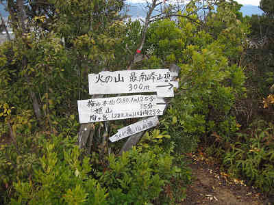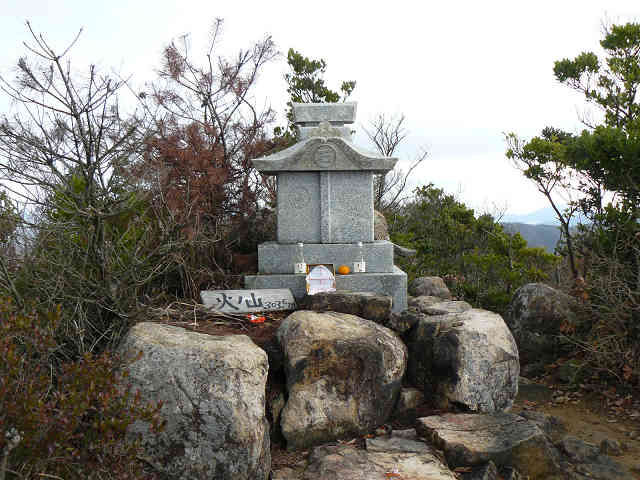 間もなくピーク手前の平坦道に着けば、左手にセミナーパークへ下る登山道の分岐を過ごす。もう少し進むと左手に亀山への縦走路が続いているが、先に火の山に向かうことにした。右手にケルンを過ごし、少し進めばすぐに2基の石祠と三角点の立つ火の山山頂に到着した。