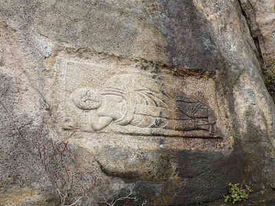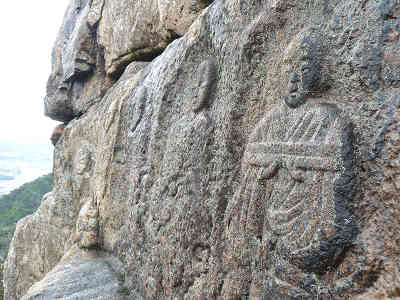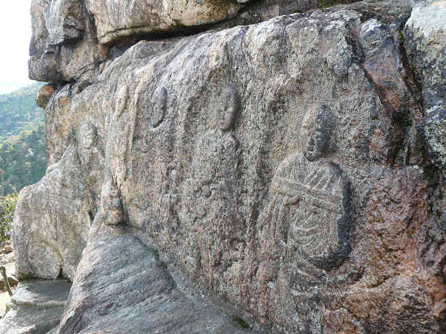 陶ヶ岳からの展望 陶ヶ岳からの展望(動画) 時刻は12時を過ぎたのでここで昼食を摂る。昼食後は少し下にある寝釈迦と十六羅漢の磨崖仏を観賞、眼下に切れ落ちた断崖をへっぴり腰で眺めた後山頂に戻り、火の山に向けて出発する。