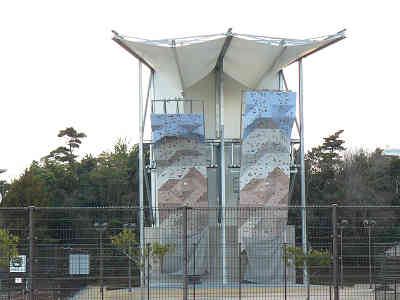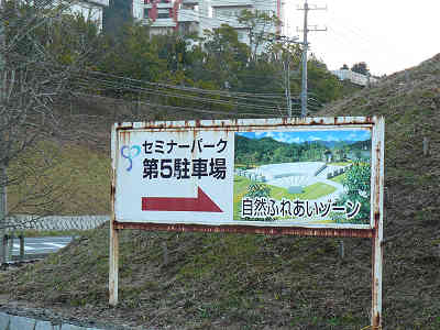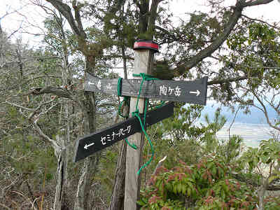 すぐに亀山への登山口を過ごし、芝生の道を進む。右手にクライミングウォールが見えてくれば左手に火の山登山口を過ごす。この先からセミナーパーク第5駐車場を経由して県道に出る。更に県道を北へ進めば、「陶ヶ岳登山口」の標識に従い、分岐を左折し進むと、陶ヶ岳駐車場に着く。