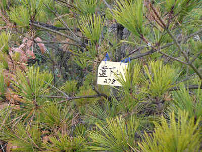 目指す亀山方面を眺めると、周囲は緑に覆われておりとても美しい。やはりロープの渡された急斜面を下り、再びロープの助けを借りながら登り返す。だんだん斜面の傾斜がきつくなる気がする。ピークに着き、火の山・亀山の展望を眺めていると遠下山278mの標識が松の木に掛けてあった。