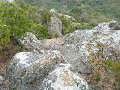 縦走路に入り、一旦下った後登り返す。背後に広がる陶ヶ岳はやはり美しい岩山である。再び岩の点在する斜面につけられたロープを掴みながら、一気に下り鞍部に到着、再び左右にシダの茂る急斜面を登って行く。GPSではこの付近が陶ヶ岳の山頂と示されている。周囲に大岩を過ごせば正面には火の山方面が広がる。
