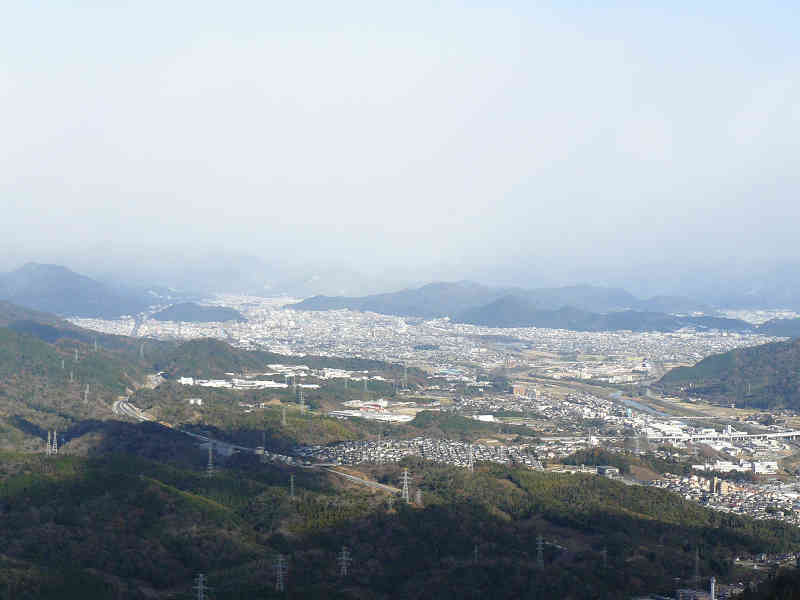 御仏峠先から眺める展望 周囲には西鳳翩山と山口市街の展望が広がっているが、前回よく見えていた眼下の大岩は、樹林の背が高くなり、ほんのわずかしか見えなくなっていた。やはり木々の成長には目を見張るものがある。