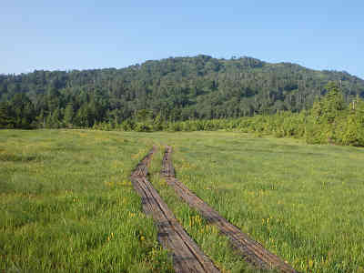 大休止の後、ミノブチ岳を出発。この先は尾瀬沼を眺め、足下に咲く花を観賞しながら尾瀬沼を目指すだけ。やがて展望がなくなり、足下に注意しながら延々と続く坂を下っていると尾瀬沼湖畔の長英新道入口へ着いた。更に木道を辿れば、目の前に広い草原の大江湿原が現れた。