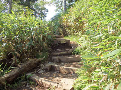 さて、駐車場から西へ移動し登山道に入る。すぐに分岐があり、燧ヶ岳へ4.5kmの案内に従い左折、南下を始める。なお、直進方向は尾瀬ヶ原の見晴で、8.9kmと書かれていた。岩や石の目立つ道に入り、少しずつ高度を上げる。周囲には樹林の背が高く、展望を得ることはできない。