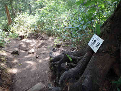 要所には木道が配置されているものの、ぬかるんだ場所もあるので、足下には注意が必要である。岩に根ざす木が珍しく、尾瀬の風景を脳裏に刻みながら進んでいると、少しずつ日が差してきた。足下不安定な石を乗り越えながら高度を上げていると、間もなく御池登山道2合目の表示が見えてきた。この登山道には節目の案内が要所に掲示されているようだ。