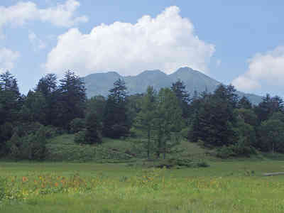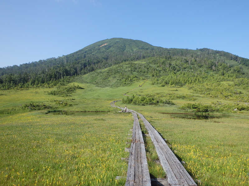 間もなく横木の階段に5合目の案内を確認、周囲にはこの季節に多いアブが旋回している。展望地からは、眼下に先ほど通過した広沢田代、その先に出発地の御池駐車場、更に先には大杉岳や会津駒ヶ岳などが一望である。 整備された木道を一登りすれば、突然目の前に現れたのが燧ヶ岳。それにしてもなんと美しい山だろうか。緩やかに下る木道を辿り、ハイマツ帯を抜ければ熊沢田代の先にそびえる燧ヶ岳が目の前に迫ってきた。このあたりの絵はテレビなどでよく見る風景なのだろうが、目の当たりにすると感動せざるを得ない。 しばらく美しい風景を眺めた後、ベンチの置かれた付近へ向かう。木道の左右に大きな池を眺め、ベンチに腰掛けて小休止。前を見ても後ろを振り返っても広い草原、一番美しい景色の中央に座っている。目指す燧ヶ岳はもう目の前に見えるが、これから先は急な坂が待っていそうだ。 熊沢田代を出発、緩やかな傾斜の木道を辿る。やがて左右に笹が茂り、少々歩き難くなるものの、笹を抜ければ展望が開ける。背後の熊沢田代の先には会津駒ヶ岳が霞みながらもそびえている。今回登山をパスした山なので、いずれは山頂を極めたいものである。
