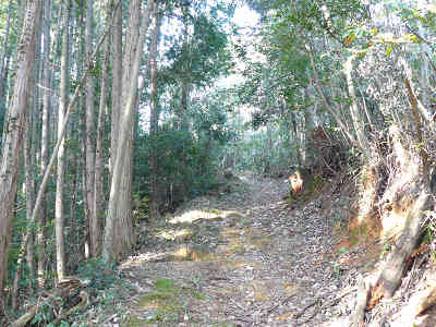 反対側にも道が続いている 山頂に引き返し、再び大きなヤマモモを観賞、山頂の岩上から再度大展望を眺めた後石段を下る。鳥居を潜り、不動さんの清水を通過、福田コース等の分岐を経由し登山口の駐車場へ到着、無事本明山の登山を終了した。