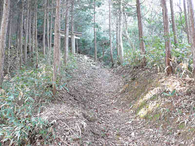 銘水の場所を出発、これから先は岩の多いジグザグな道へ向かう。少し高度を上げればすぐに鳥居の立つ場所に到着、右に鳥居を見て、左側へも道が続いていた。左側には何があるのか興味もあるので向かってみると、広く平坦な場所に着いた。ここには何か建物が置かれていたのかも知れない。