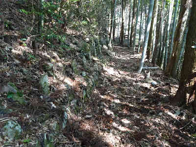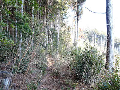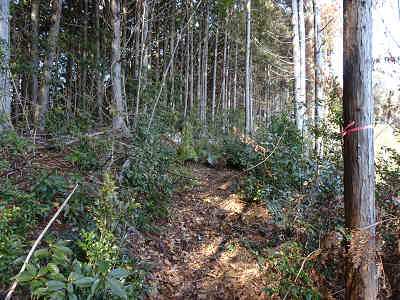 大師堂の右側から尾根道を通って北へ進む。伐採地付近では茨に悩まされたが、樹林の下に着けばこの悩みからは解放される。倒木を迂回し少しずつ高度を上げる。