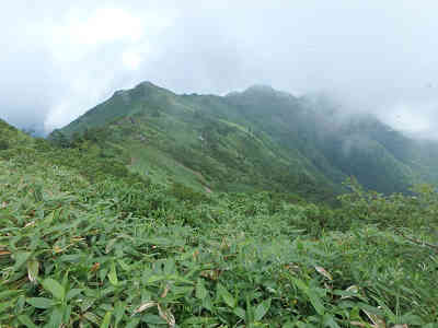 相変わらずの急登を楽しみながら高度を上げていると突然西に展望が開けるものの、山頂部は雲に覆われていた。ようやく前方に目指す剣ヶ峰山を確認、こちらの方面は霧も無くしっかり山容を確認することができた。間もなく岩の多い地点へ着くと、ここが左右の分岐で左は武尊山、右が剣ヶ峰山へと続いている。