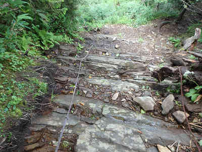 休憩を兼ねてのんびり写真を撮り、武尊沢を出発。急な傾斜の道を進んでいたら、ストックの先が取れていた。そこで、ストックの先を探していたら、後ろから来た登山者がどこかで見たというので探してみると、すぐに見つけることができた。この先からは急な傾斜の道を一気に高度を上げる感じで進む。