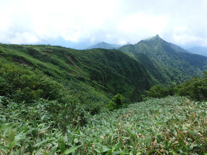 周囲の展望をあきらめて下山を開始したところ、少し下った所で晴れ間が戻り、剣ヶ峰山や武尊山などの展望を眺めることができた。充分満足な展望を楽しんだ後、更に下山を続ける。周囲にはしゃくなげが多く、花期には美しい花畑が広がることだろう。