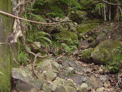 この先から杉の植林帯につけられた、急な坂道をジグザグに下りて行く。沢沿いに下り、岩の点在する場所を通過、杉の倒木帯を過ごせば、昔の民家跡と思われる石垣の整備された場所に着く。この付近から周囲に滝が目立ち、美しい風景にしばしば足が止まる。苔むした大木、美しい滑滝に大滝、沢沿いを快適に下りて行けば、間もなく最後の民家が右手に見えてきた。