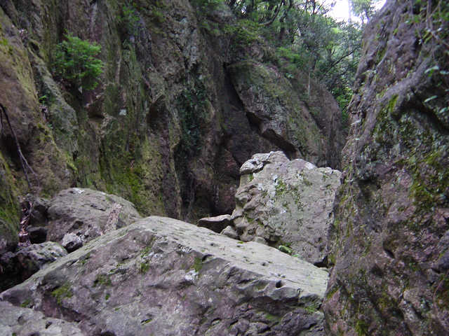 の崩れやすい急斜面 すぐに観音岩コースの分岐を過ごし、岩を乗り越えて行く。岩の崩れやすい急斜面なので、落石を起こさないよう慎重に登る。背後を振り返れば、その角度に思わずニンマリ、なんと急な坂を登ってきたものだ。再び観音岩コースの分岐を過ごせば、登山道は右へ向かい、ゴルジュへの入口に到着した。