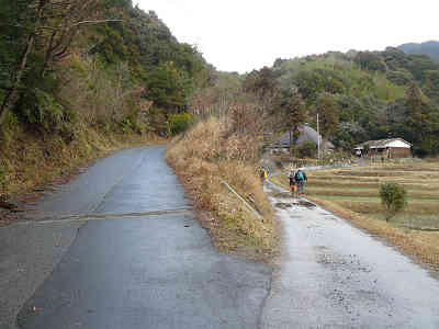 神社を出発し、舗装路を北へ進むと分岐が現れるので、民家に向かって右の道を採る。以前藁葺き屋根だったこの家はトタン屋根に変わっていた。たった6年半の歳月により、周囲の展望は激変、前方に見える白滝山付近には風力発電用施設が建っており、登山口の説明に寄れば、最終的にはこの付近に20基の風車が建つそうだ。