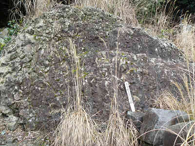 眼下に広がる展望を眺め、登山口右手の「せんたく岩」を観賞後、登山口に向かう。頭上には麓から見えていた岩肌が美しく聳えている。岩の点在する歩きにくい道を少し進み、地蔵様の鎮座される右下の岩屋広場に向かう。