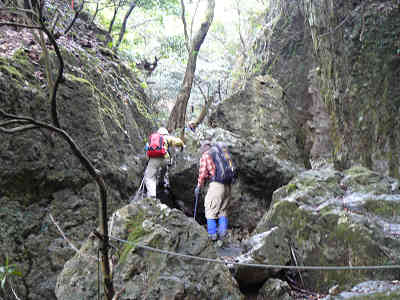 目の前に広がる背丈以上の大岩、これから向かう岩場に感激する。危険箇所にはロープが設置してあるので慎重に岩を乗り越えれば大丈夫。但し、本日は水量が多く、岩が雨に濡れて滑りやすくなっているので、細心の注意が必要だ。
