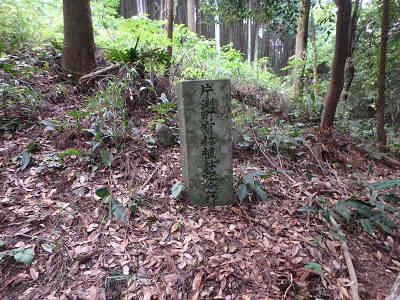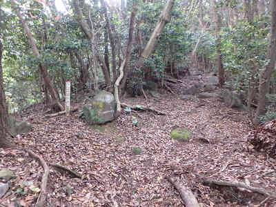 手製の案内に従い少し坂を下ると岩の横を抜ける。植林帯の中につけられた道を下ると鞍部へ着き、鞍部から右方向には片淵中学校の案内が置かれていた。ここで「県指定史跡烽火山のかま跡」の案内を眺めて自然林の中に入る。
