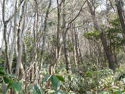 更に5分弱進めば、次のチェックポイントは左手の炭焼き跡。炭焼き跡を確認したら左手に直登する道を採る。檜の植林帯につけられた目印のテープに従って登ればすぐに尾根に到着、右に進路を取り尾根を外さないよう目印のテープに従って進んで行く。